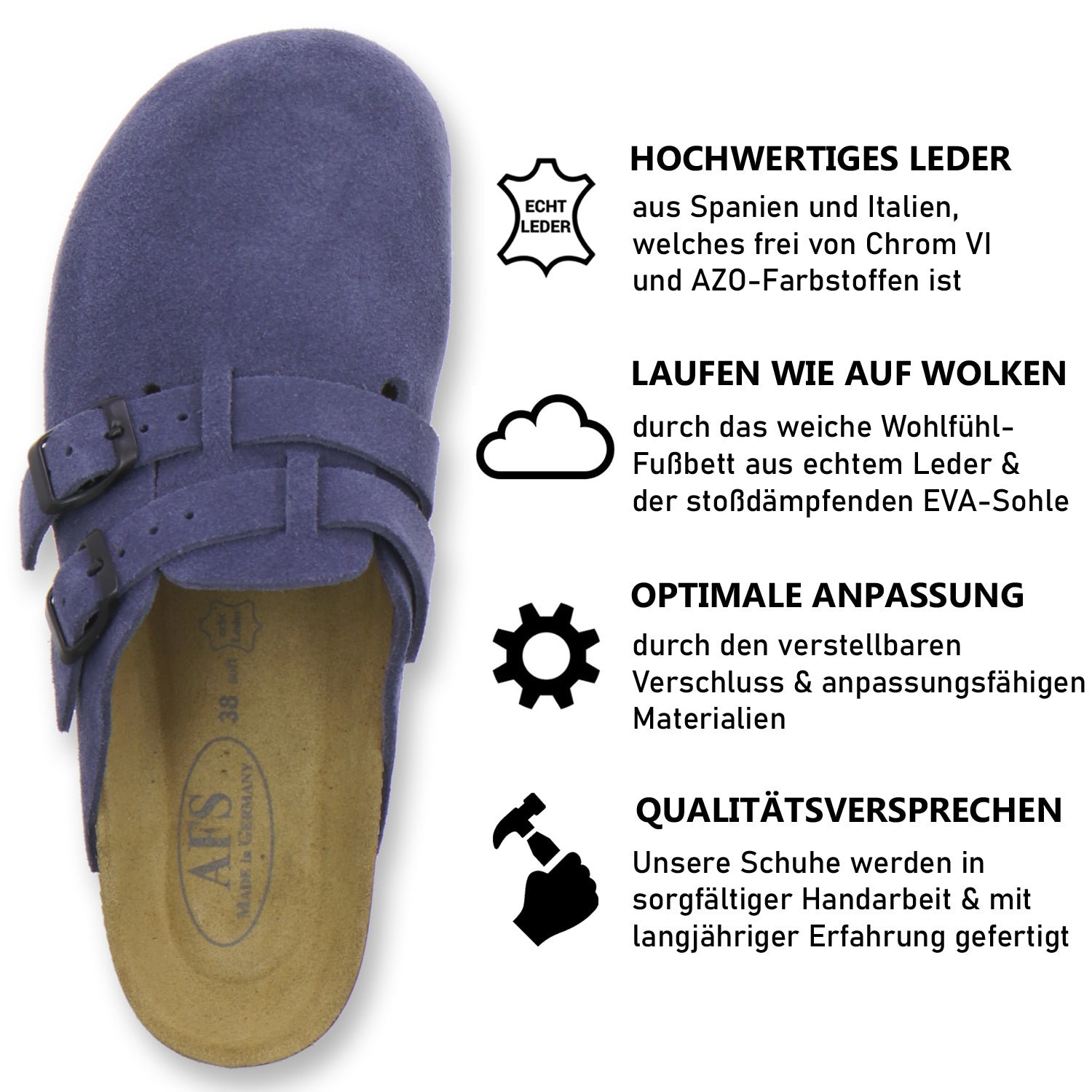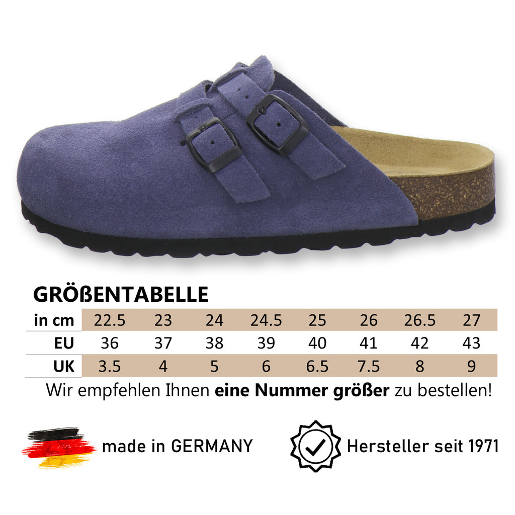 Die komfortablen Schuhe werden zu 100% in Deutschland hergestellt und garantieren eine hohe Qualität. Das hochwertige echte Leder, welches sowohl als Innen- als auch als Obermaterial der Clogs verwendet wird, stammt aus Italien und Spanien.