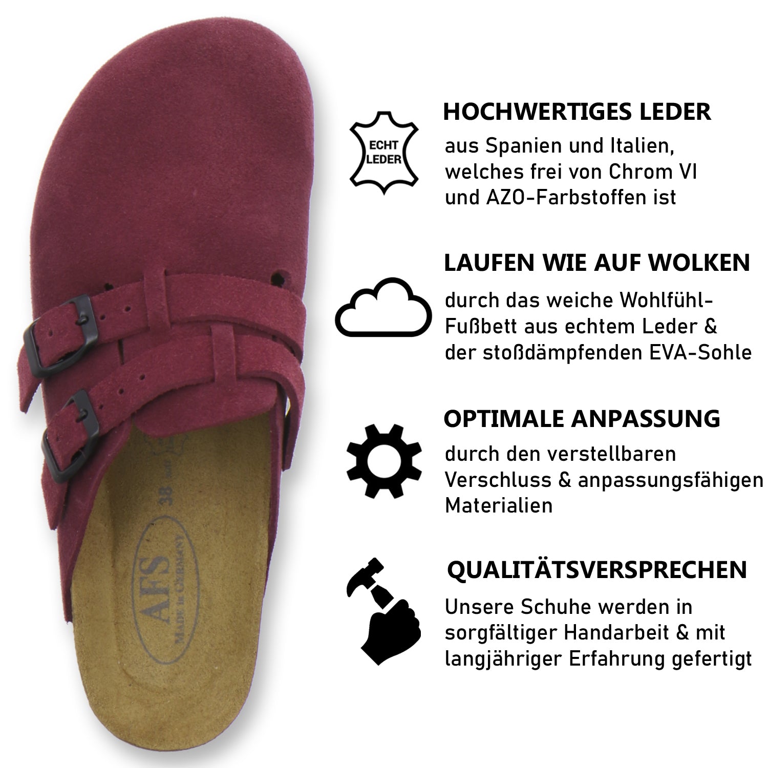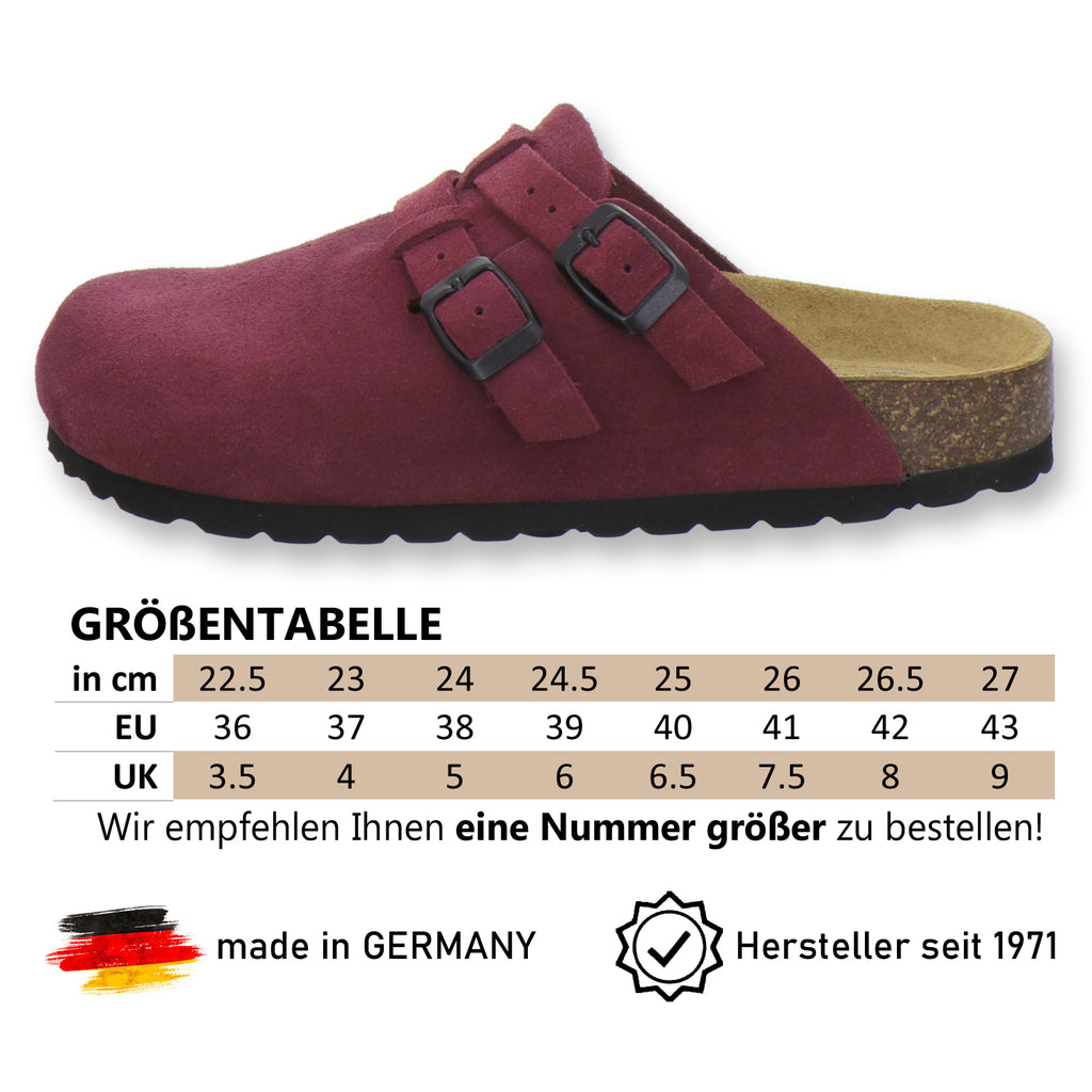 Die komfortablen Schuhe werden zu 100% in Deutschland hergestellt und garantieren eine hohe Qualität. Das hochwertige echte Leder, welches sowohl als Innen- als auch als Obermaterial der Clogs verwendet wird, stammt aus Italien und Spanien.