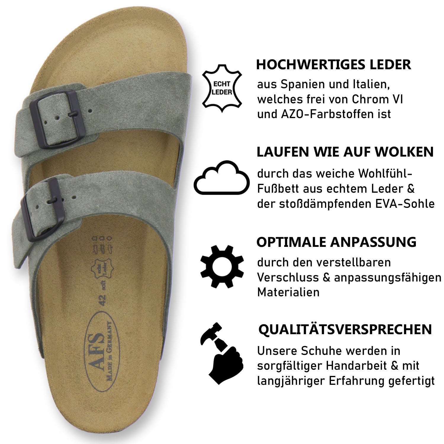 La semelle intérieure est précieuse et confortable grâce au liège naturel doux, anatomiquement formé et travaillé. Grâce à nos normes élevées, vous remarquerez une grande différence par rapport aux chaussures conventionnelles.