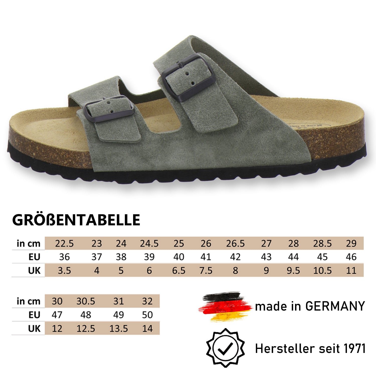 Ces chaussures confortables sont fabriquées à 100% en Allemagne et garantissent une haute qualité. Le cuir exclusivement de haute qualité, utilisé aussi bien comme doublure que comme matériau extérieur des pantoufles, provient d'Italie et d'Espagne.