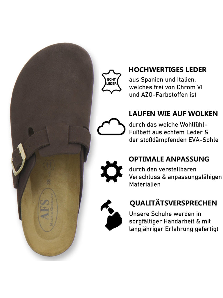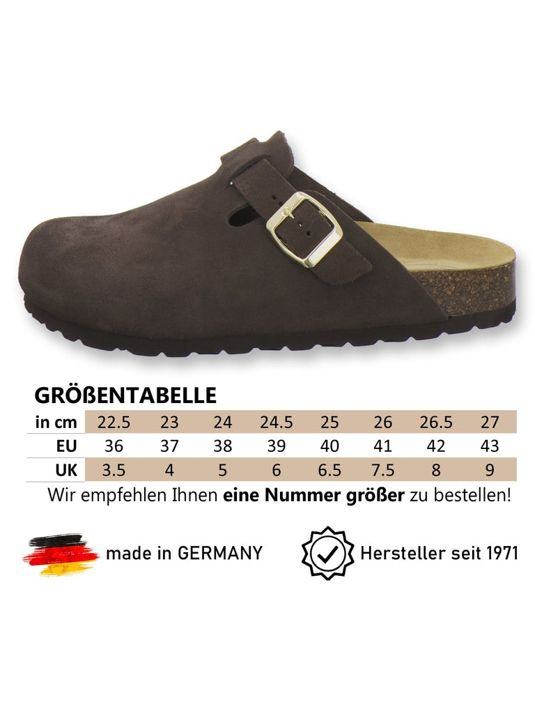 Die komfortablen Schuhe werden zu 100% in Deutschland hergestellt und garantieren eine hohe Qualität. Das hochwertige echte Leder, welches sowohl als Innen- als auch als Obermaterial der Clogs verwendet wird, stammt aus Italien und Spanien.