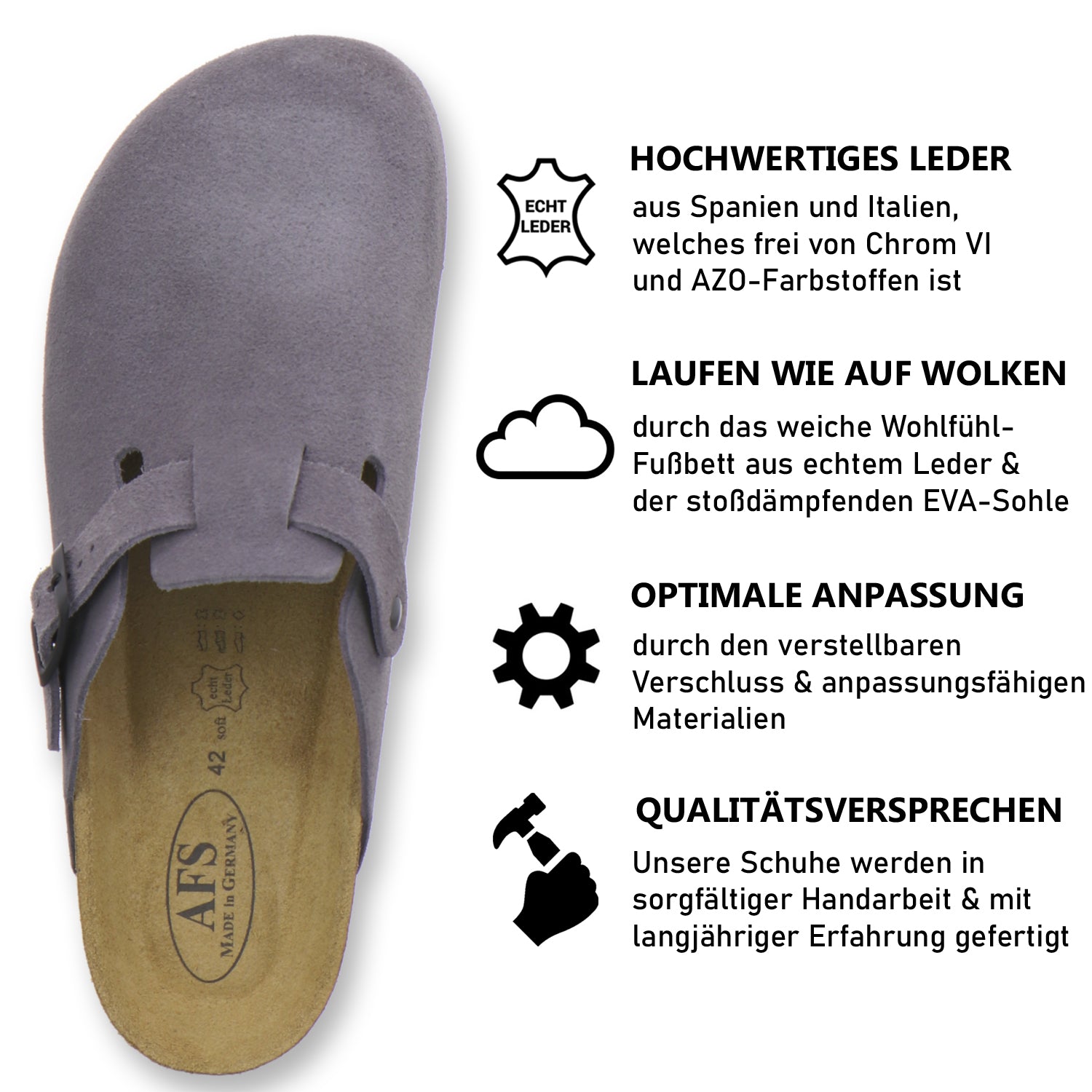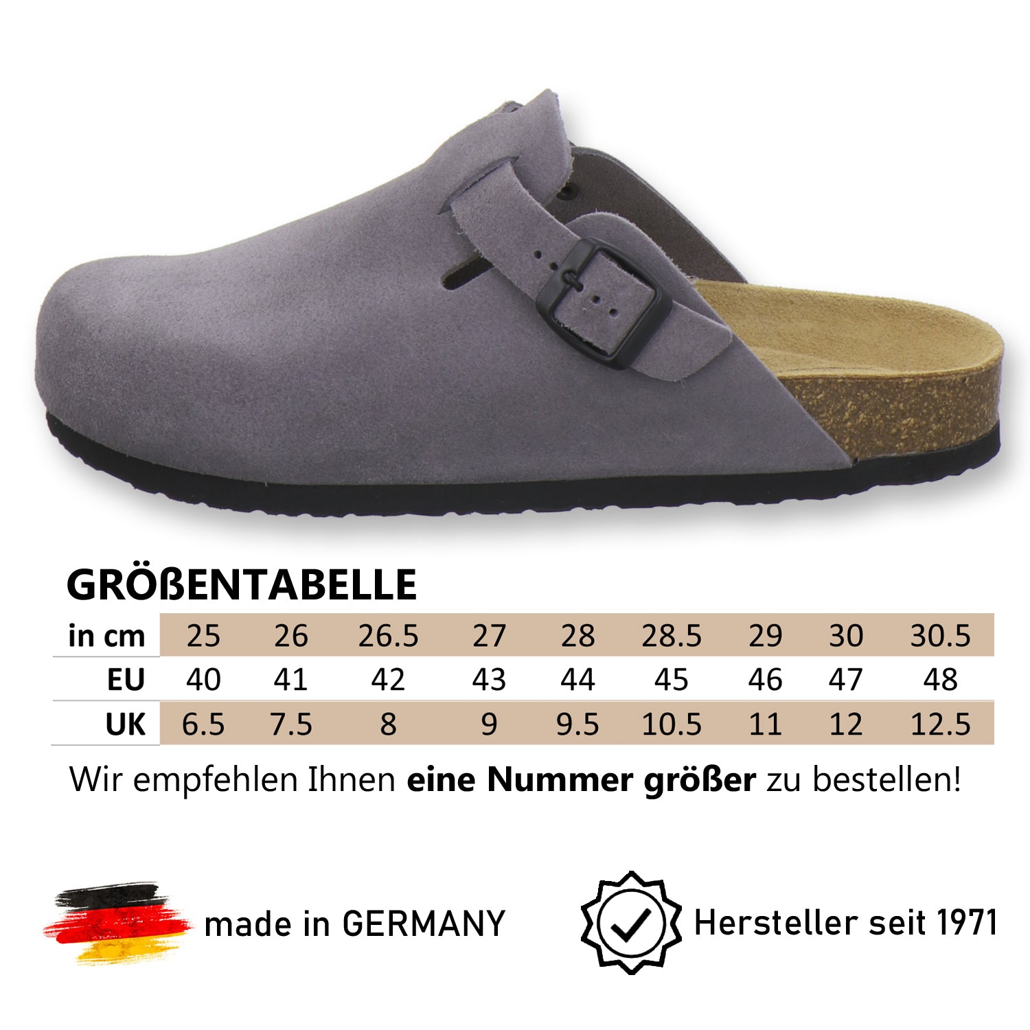 Die komfortablen Schuhe werden zu 100% in Deutschland hergestellt und garantieren eine hohe Qualität. Das hochwertige echte Leder, welches sowohl als Innen- als auch als Obermaterial der Clogs verwendet wird, stammt aus Italien und Spanien.