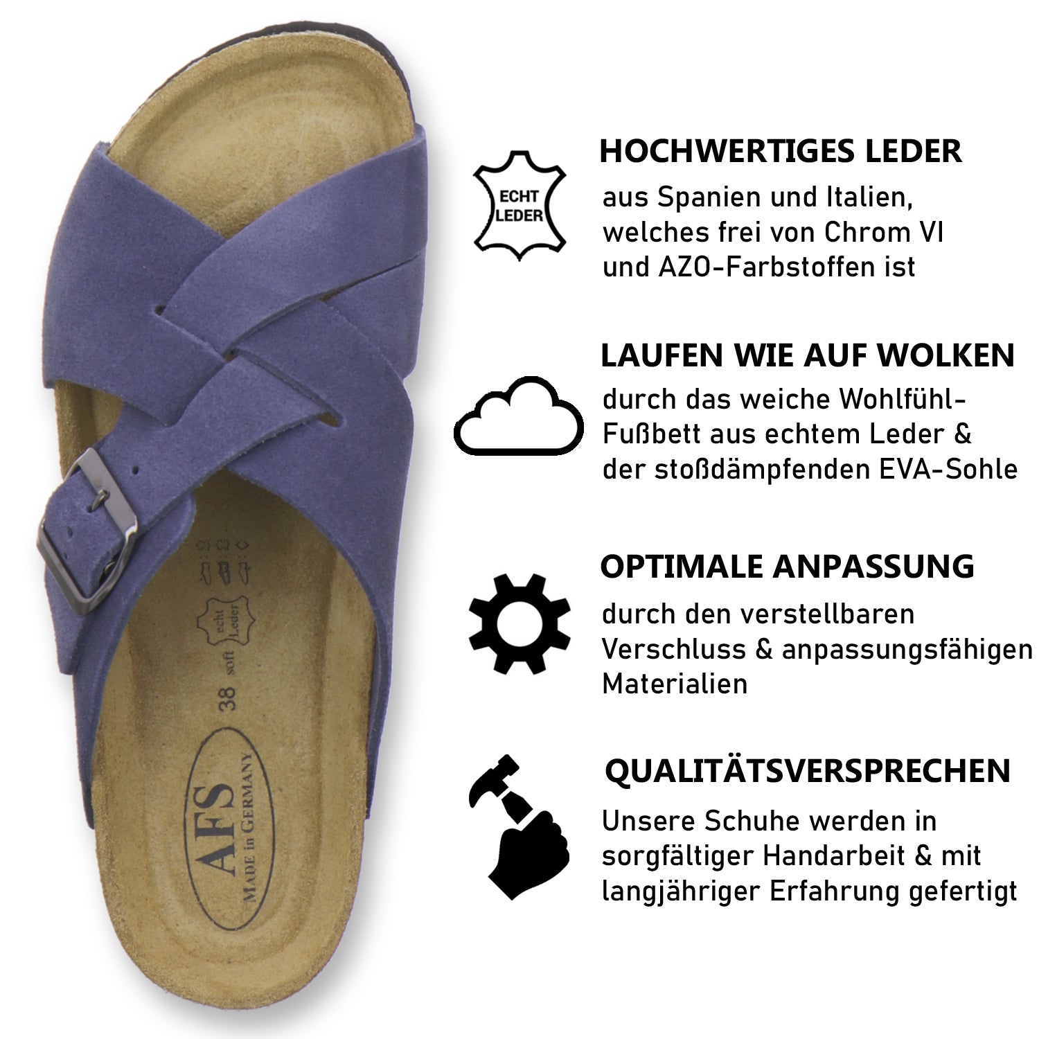 Unsere Pantoletten Sandalen für Damen sind die ideale Wahl für heiße Sommertage oder entspannte Stunden im Haus. Gefertigt aus hochwertigem Leder, sorgen sie nicht nur für einen eleganten Look, sondern auch für ein angenehmes Tragegefühl. Das ergonomische Fußbett unterstützt die natürliche Fußform und verhindert Ermüdung, selbst bei langem Tragen. Der Schnallenverschluss ermöglicht eine individuelle Anpassung, während das strapazierfähige Material Langlebigkeit garantiert. Diese Sandalen sind nicht nur bequem, sondern auch ein Statement für Qualität und Nachhaltigkeit - made in Germany.