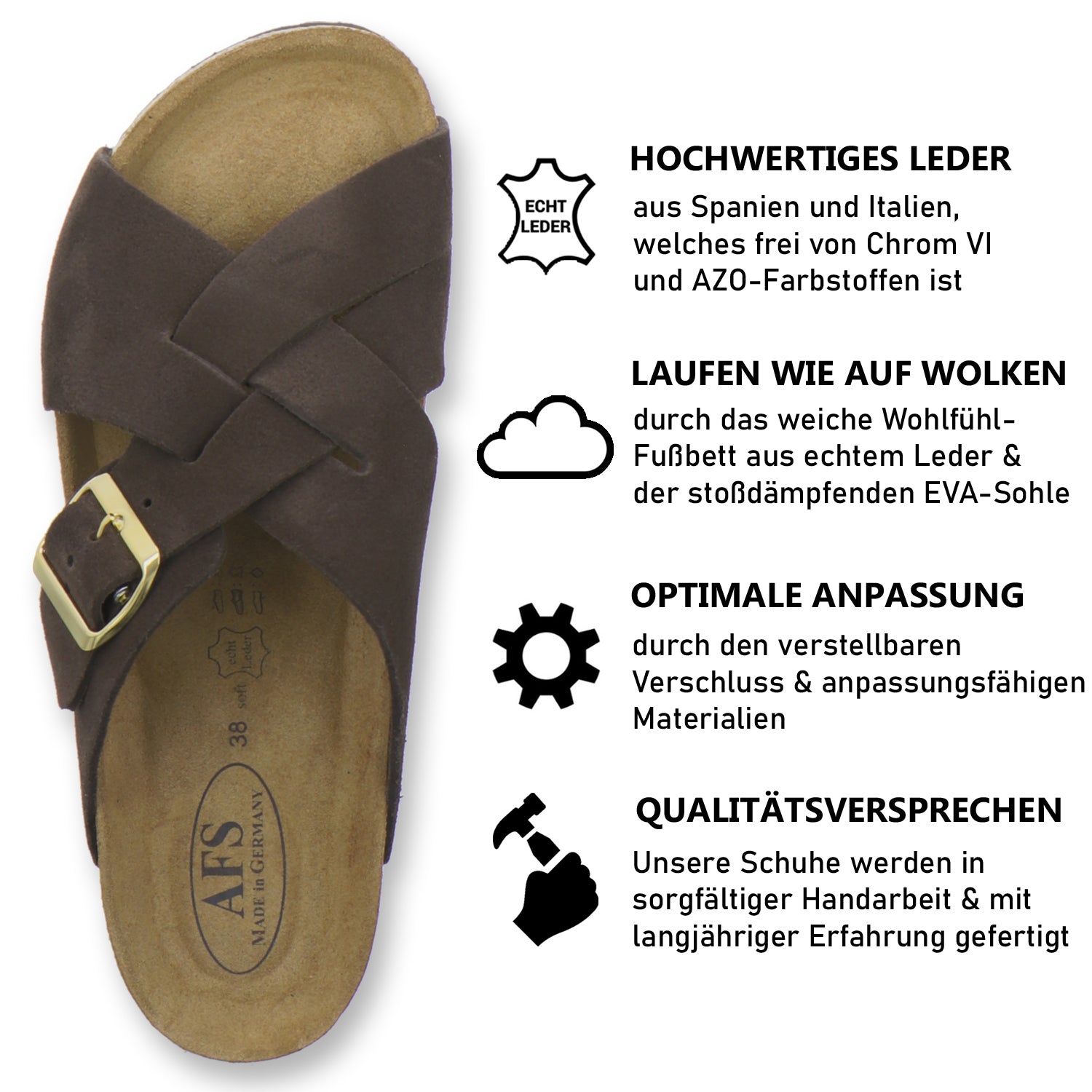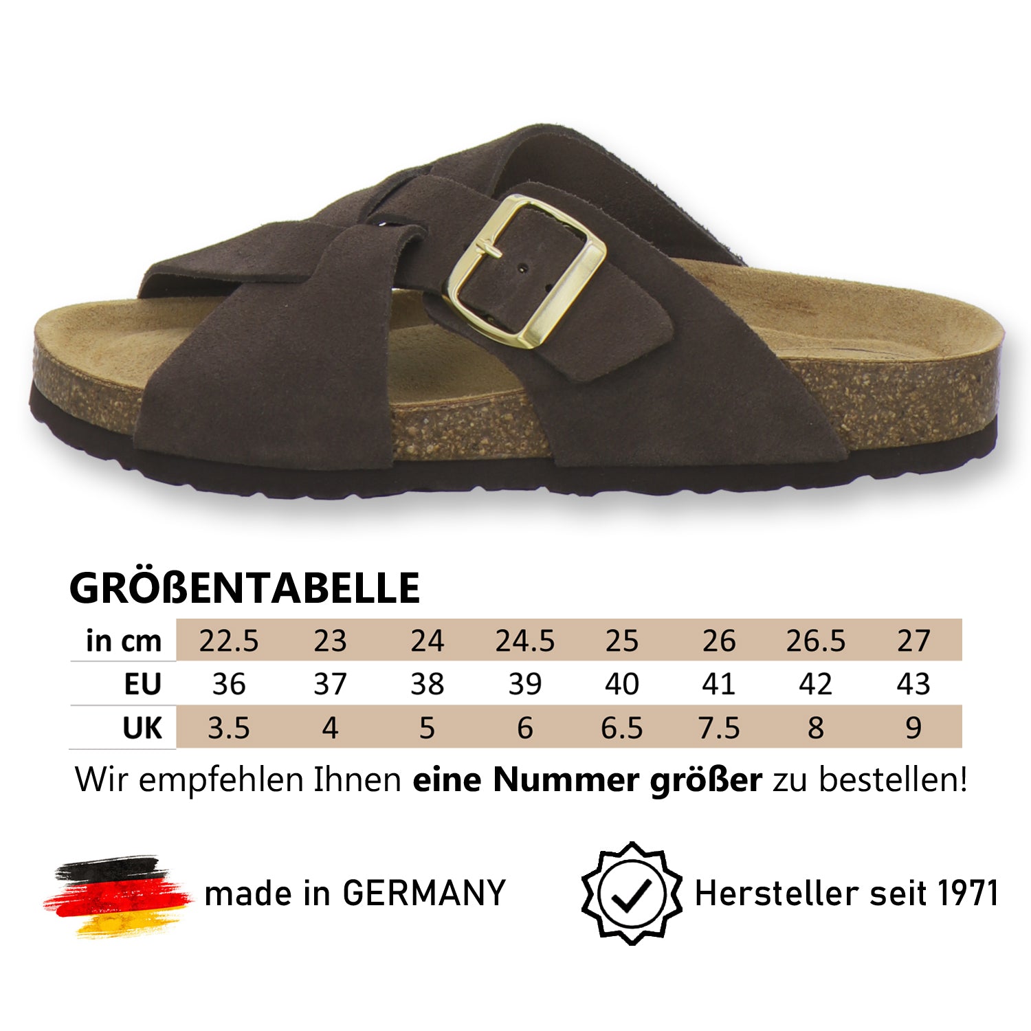 Unsere Pantoletten Sandalen für Damen sind die ideale Wahl für heiße Sommertage oder entspannte Stunden im Haus. Gefertigt aus hochwertigem Leder, sorgen sie nicht nur für einen eleganten Look, sondern auch für ein angenehmes Tragegefühl. Das ergonomische Fußbett unterstützt die natürliche Fußform und verhindert Ermüdung, selbst bei langem Tragen. Der Schnallenverschluss ermöglicht eine individuelle Anpassung, während das strapazierfähige Material Langlebigkeit garantiert. Diese Sandalen sind nicht nur bequem, sondern auch ein Statement für Qualität und Nachhaltigkeit - made in Germany.