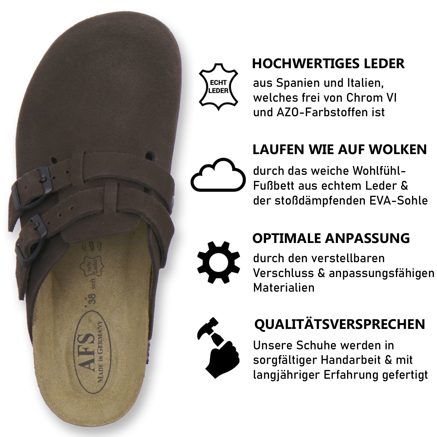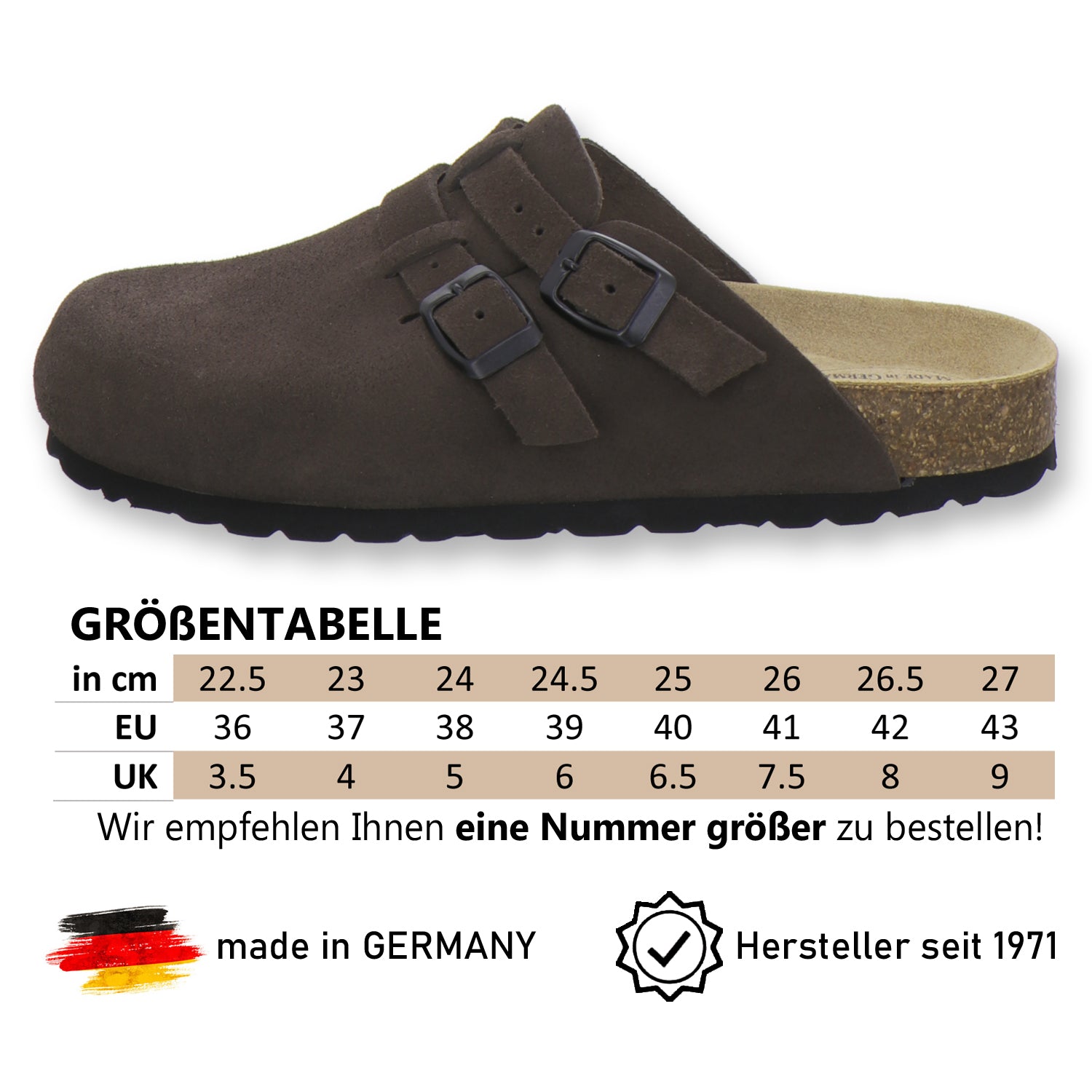 Die komfortablen Schuhe werden zu 100% in Deutschland hergestellt und garantieren eine hohe Qualität. Das hochwertige echte Leder, welches sowohl als Innen- als auch als Obermaterial der Clogs verwendet wird, stammt aus Italien und Spanien.
