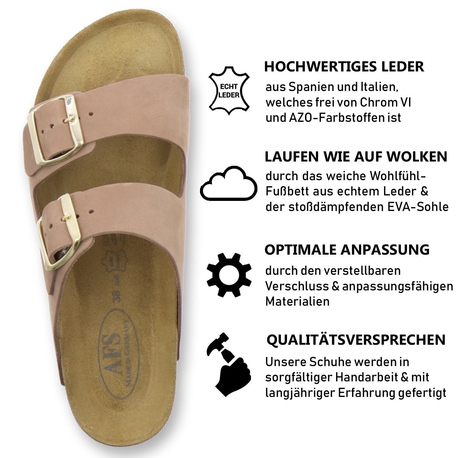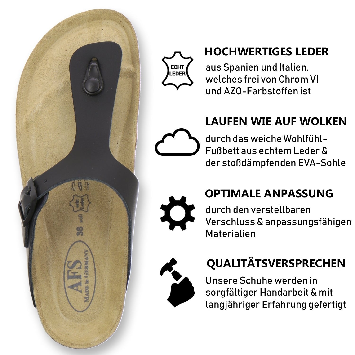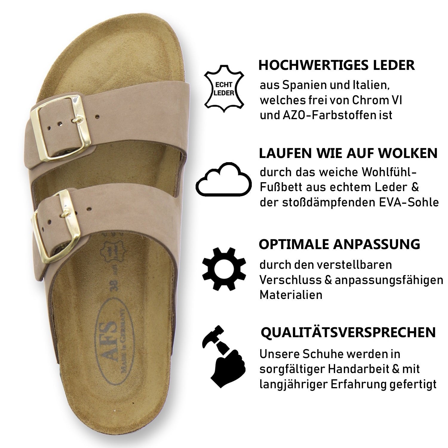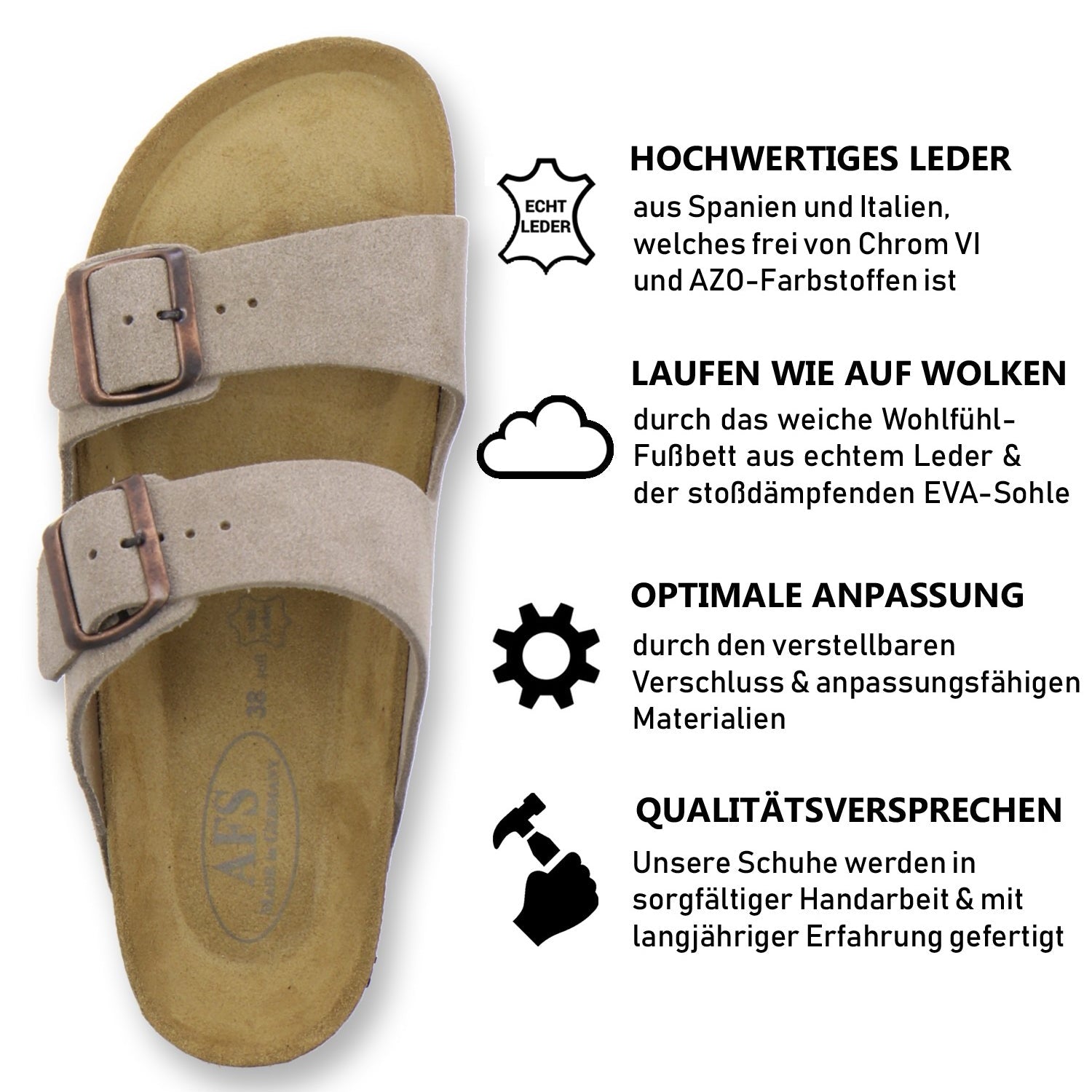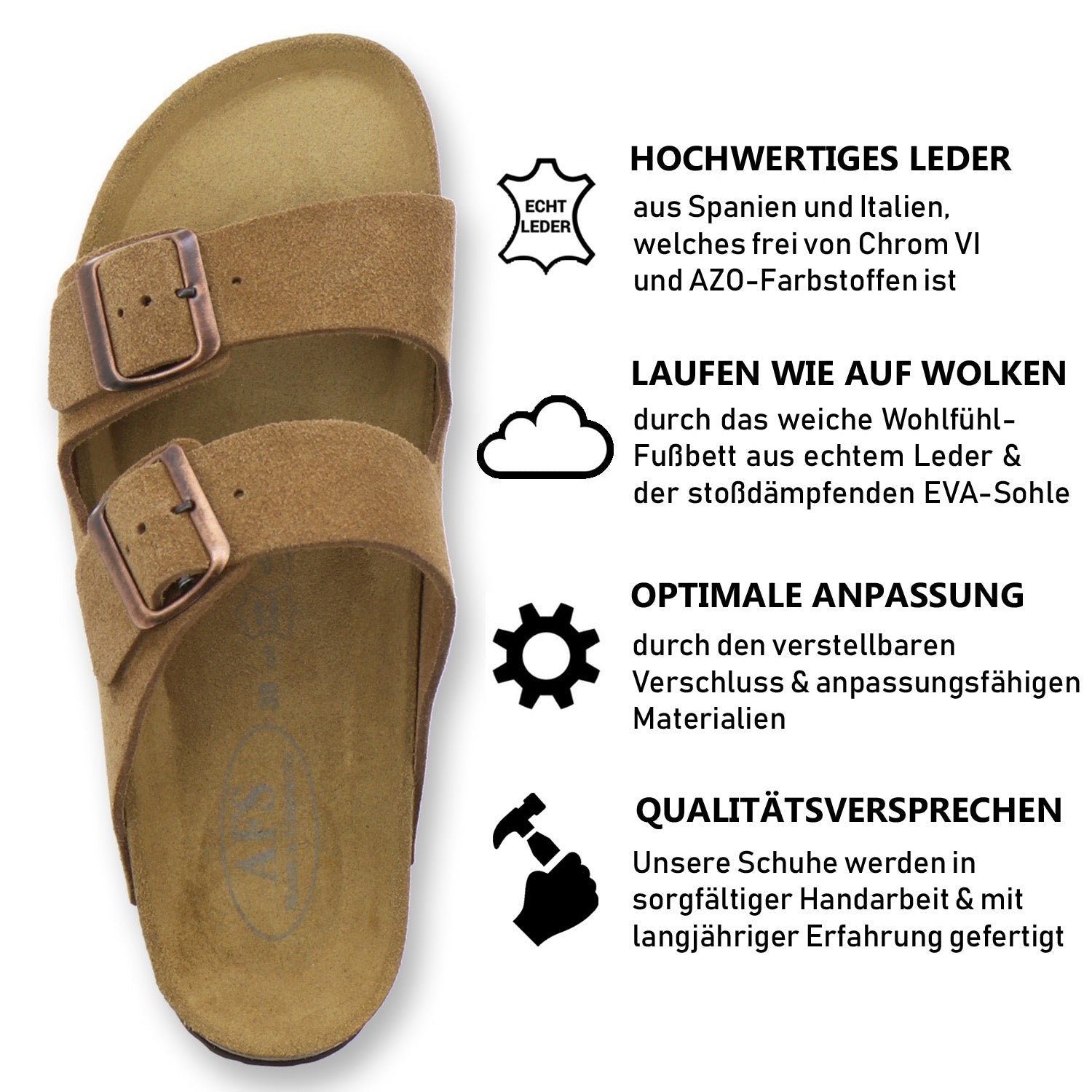 Die komfortablen Schuhe werden zu 100% in Deutschland hergestellt und garantieren eine hohe Qualität. Das ausschließlich hochwertige Leder, welches sowohl als Innen- als auch als Obermaterial der Pantoffeln verwendet wird, kommt aus Italien und Spanien.